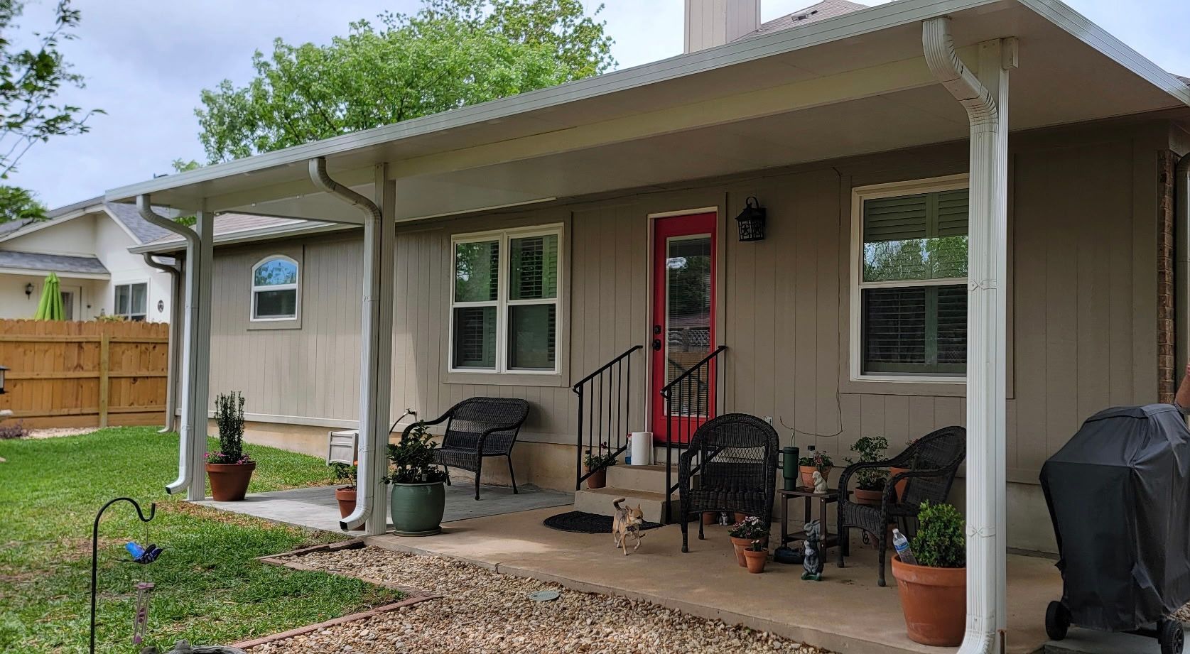This is a 10' wide addition to a 3" insulated Patio Cover we just completed on 4/3/26 in Georgetown Tx. You can clearly see the original vs new concrete placement. 3" insulated covers in most cases are easy to add onto. The 3" insulated is a very affordable option to wooden stick frame projects requiring much less material.
